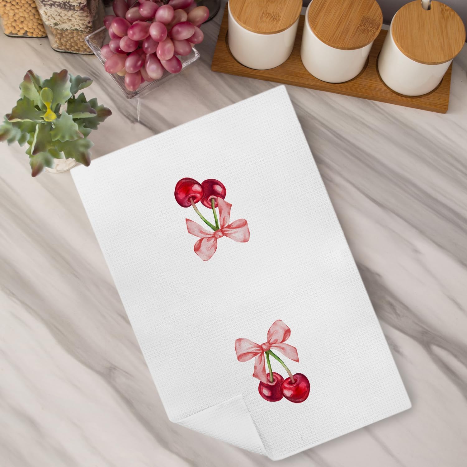 Pink Bow Cherry Coquette Kitchen Towels, Pink Preppy Hand Towels for Bathroom, Preppy Coquette Bathroom Decor, Cherry Kitchen Decor, Pink Bow Dish Towels Tea Towels for Kitchen, 16x24 Inches